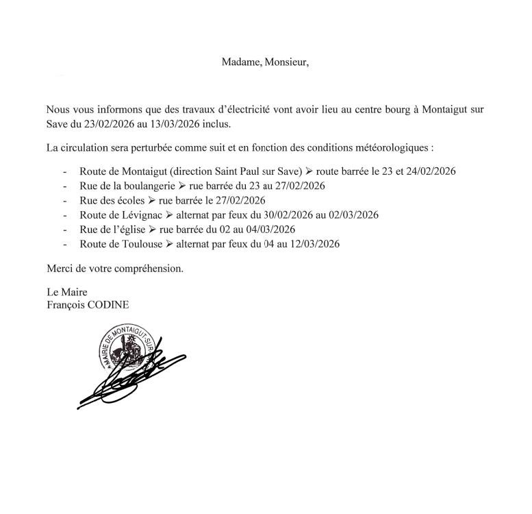 Une information de travaux de la ville de Montaigut sur Save pour les usagers qui empruntent ces voies.