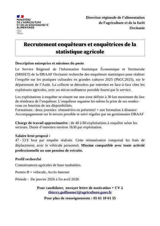 Le Service Régional de l’Information Statistique, Économique et Territoriale (SRISET) de la DRAAF Occitanie recherche des enquêteurs ou enquêtrices de la statistique agricole publique afin de mener des enquêtes sur des thématiques liées à l’agriculture, à la forêt et à l’occupation du territoire. Les données recueillies sont essentielles pour piloter les politiques agricoles nationales et européennes.