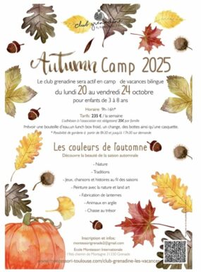 Le Club Grenadine de l’école Montessori Internationale vous invite à un camp de vacances bilingue, du lundi 20 au vendredi 24 Octobre 2025. Les enfants plongeront dans l’univers des saisons et des couleurs changeantes de la Nature à travers des activités enrichissantes et ludiques.