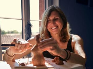 « Il y a plus de 25 ans, je découvre la sculpture sur terre dans un atelier toulousain. Influencée par de grands sculpteurs cubistes, je vais apprendre, et jouer, avec les contraintes de l’argile. De formation scientifique, sculpter me permet d’exprimer une autre face de ma personnalité, dans des œuvres parfois aux frontières du réel. Je démarre généralement par un croquis représentant une forme humaine, animale ou végétale, ou bien les trois. Le ponçage (après séchage) et la patine (après cuisson) donneront l’aspect final à la culture : une pièce unique, épurée et colorée, exprimant une réalité revisitée en jouant avec la matière et la couleur.«