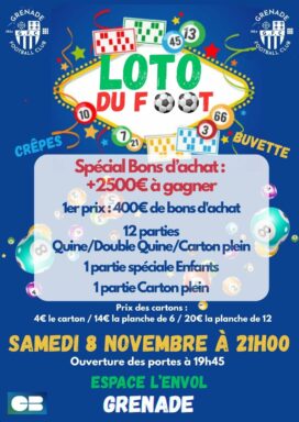 Rendez-vous samedi 08 novembre à partir de 19h45 pour le Grand loto du Grenade Football Club !